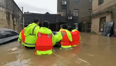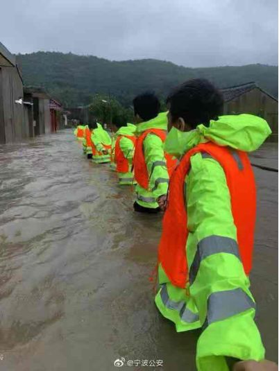 宁波公安百余名特警火速增员,风大水急,为了不被冲散,民警手拉着手涉水入村,挨家挨户转移群众。