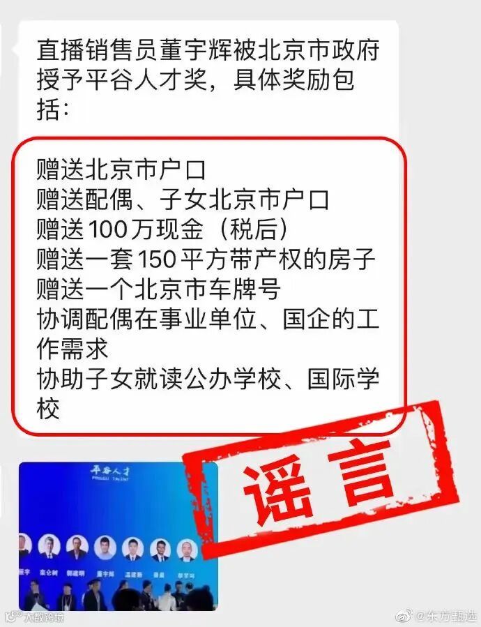 网传北京平谷区将为董宇辉落户,并赠送100万元现金、一套150平方米带产权住房和一个车牌号等。