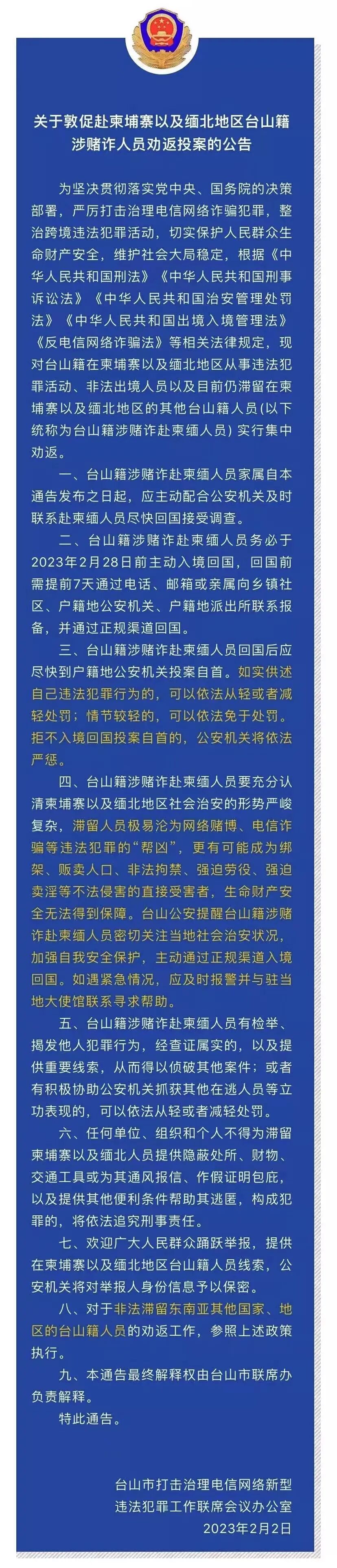 为坚决贯彻落实党中央、国务院的决策部署,严厉打击治理电信网络诈骗犯罪,整治跨境违法犯罪活动,切实保护人民群众生命财产安全,维护社会大局稳定,根据《中华人民共和国刑法》《中华人民共和国刑事诉讼法》《中华人民共和国治安管理处罚法》《中华人民共和国出境入境管理法》《反电信网络诈骗法》等相关法律规定,现对台山籍在柬埔寨以及缅北地区从事违法犯罪活动、非法出境人员以及目前仍滞留在柬埔寨以及缅北地区的其他台山籍人员(以下统称为台山籍涉赌诈赴柬缅人员) 实行集中劝返。