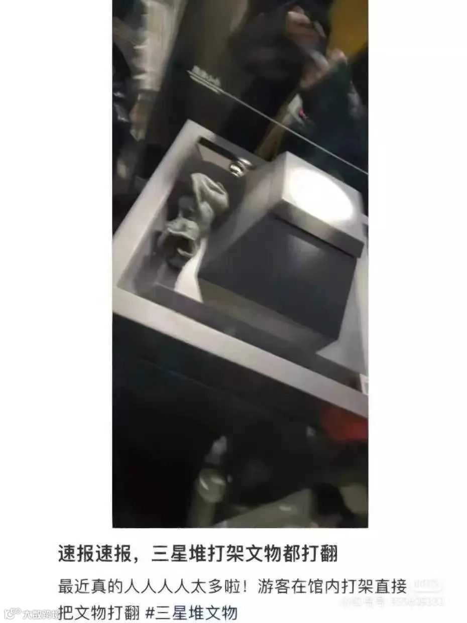 1月25日,有网友在社交平台发布图文称,“三星堆博物馆里打群架……撞动了展示柜……文物跌落……”,其配图是一青铜文物处于展示台底部,整体呈现侧躺姿势。