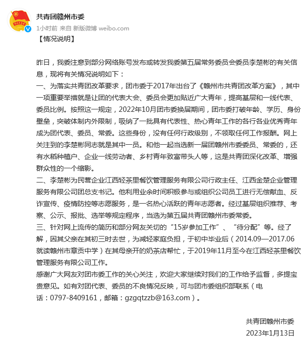 三、针对网上流传的简历和部分网友关切的“15岁参加工作”、“待分配”等。经了解,因其父亲在其初三时去世,为减轻家庭负担,于初中毕业后(2014.09—2017.06就读赣州市章贡中学)在其母亲开的奶茶店帮忙,于2019年11月至今在江西轻茶里餐饮管理服务有限公司工作。