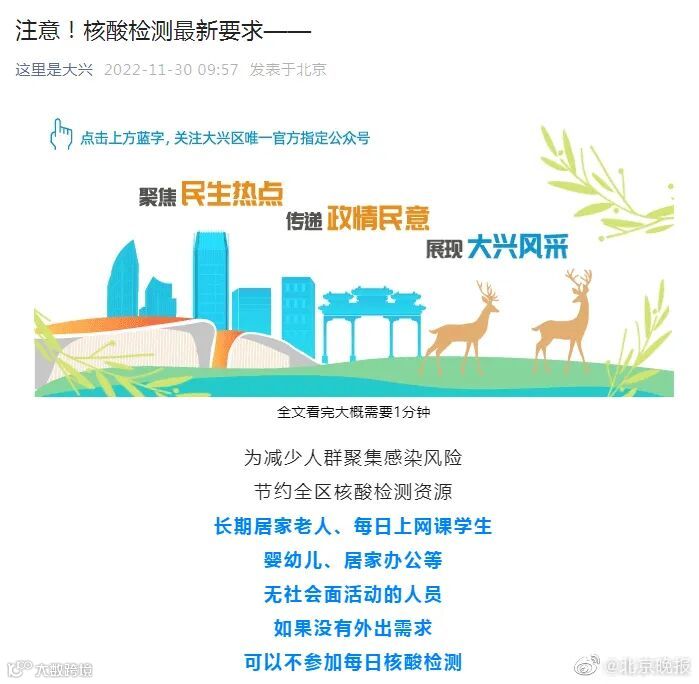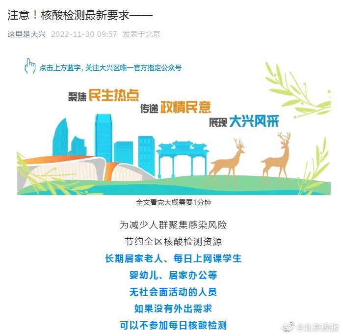 30日,大兴区发布通知,为减少人群聚集感染风险,节约全区核酸检测资源,长期居家老人、每日上网课学生、婴幼儿、居家办公等无社会面活动的人员,如果没有外出需求,可以不参加每日核酸检测。