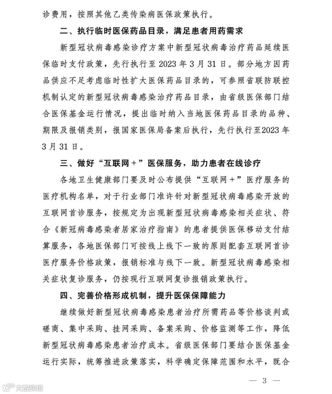 《通知》明确,新型冠状病毒感染诊疗方案中新型冠状病毒治疗药品延续医保临时支付政策,先行执行至2023年3月31日。部分地方因药品供应不足考虑临时性扩大医保药品目录的,可参照省联防联控机制认定的新型冠状病毒感染治疗药品目录,由省级医保部门结合医保基金运行情况,提出临时纳入当地医保药品目录的品种、期限及报销类别,报国家医保局备案后执行,先行执行至2023年3月31日。