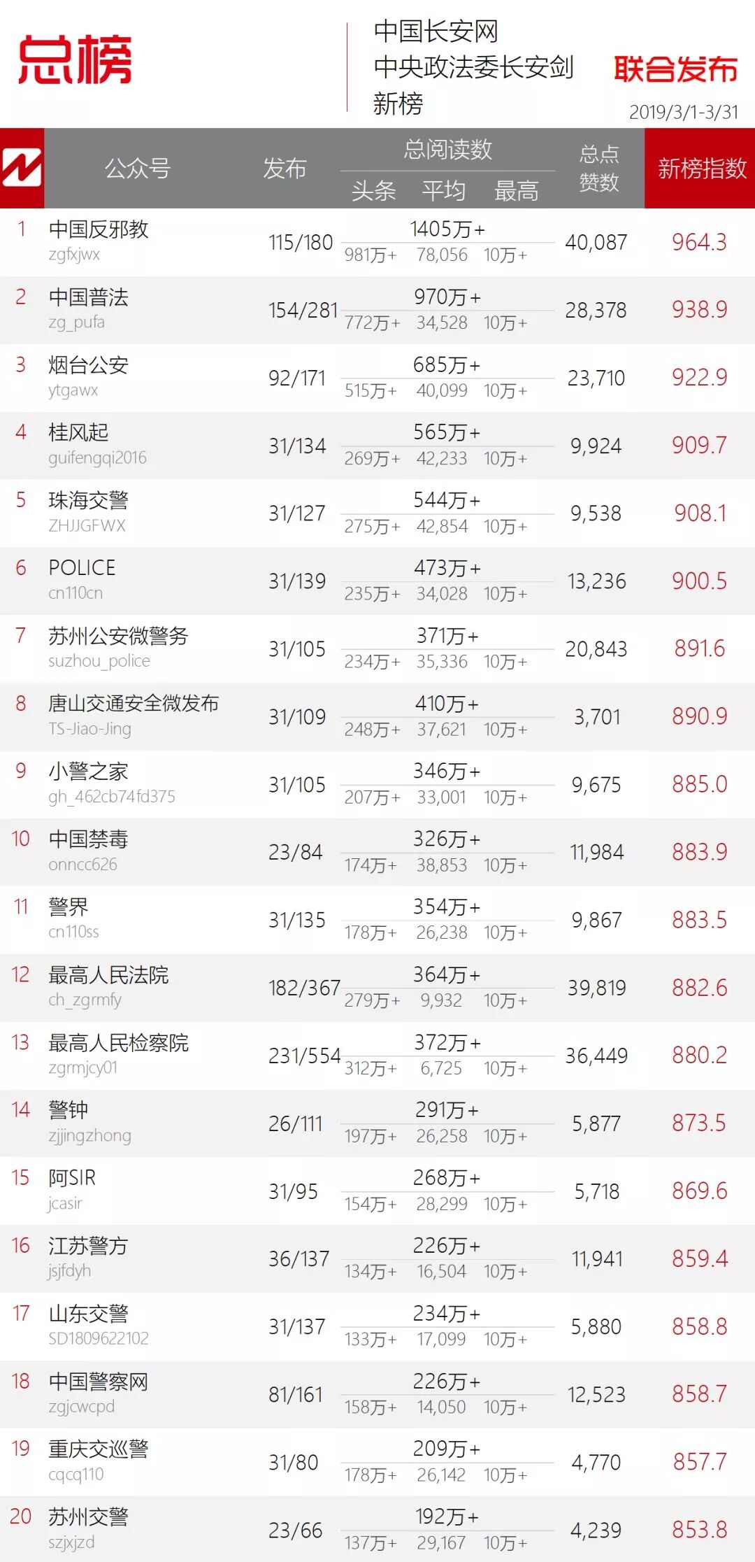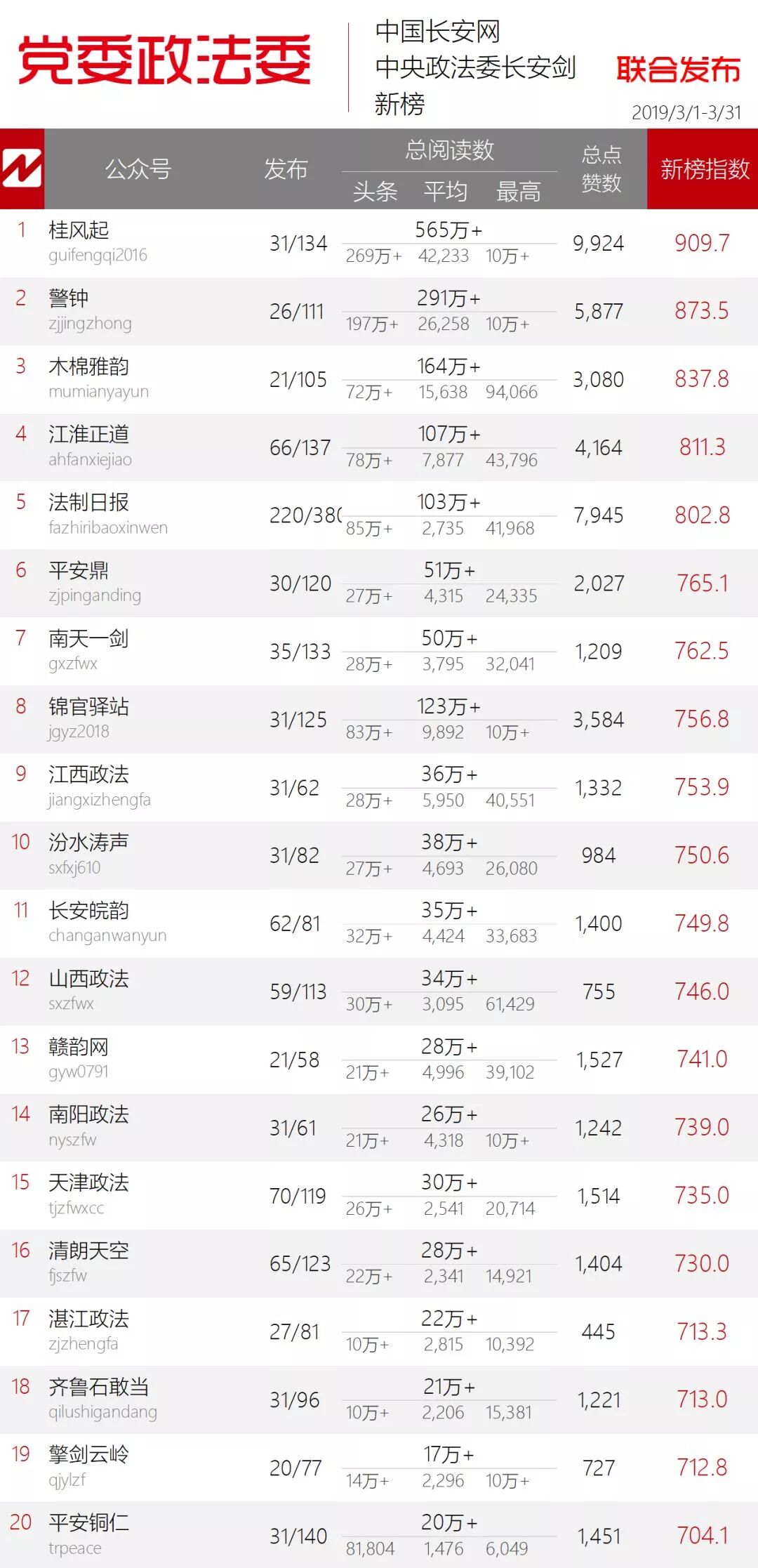 草长莺飞四月天,全国政法系统微信影响力排行榜再度来袭!由中国长安网、“中央政法委长安剑”微信公众号和新榜联合发布“全国政法系统微信影响力排行榜”,今日发布第2期榜单。