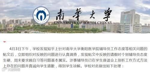 2、南华大学回应学生奶奶病危请假遭拒:修改请假制度 近日,南华大学学生称辅导员工作态度恶劣,奶奶病危找其请假被拒绝。南华大学5日回应:对涉事辅导员给予通报批评,学院修改学生请假审批制度。(@南华大学)