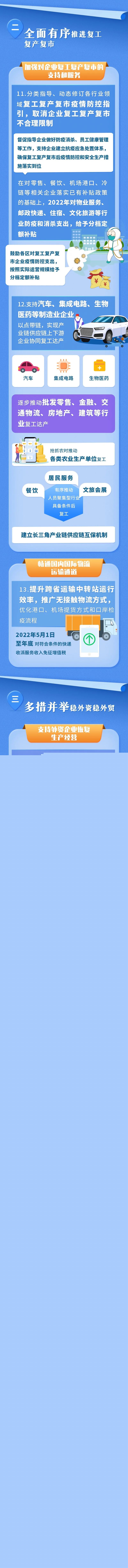 复工复产、复商复市是当前各类企业非常关注的问题。针对复工复产卡点堵点,提出了分类指导、动态修订复工复产复市疫情防控指引、取消企业复工复产复市不合理限制,6月1日起取消企业复工复产审批制度,扩大企业防疫和消杀补贴范围、建立长三角产业链供应链互保机制、畅通国内国际物流运输通道等政策措施,支持各行业领域复工复产复市,稳步提高企业达产率。