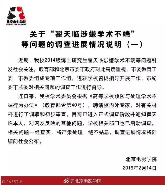针对近期社会关注的“翟天临涉嫌学术不端”等问题,北京电影学院14日通过官方微博表示,目前北京市委教育工委、市教委组成专项工作组进驻学校督促指导开展工作,北京市纪委市监委对相关问题的调查工作进行督导。目前已进入正式调查阶段。对于网友反映的其他问题,学校相关部门已启动调查,相关问题一经查实,将严肃处理,绝不姑息。