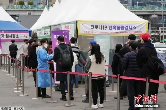 资料图:当地时间2022年3月17日,一名医务人员在韩国首尔的一个临时检测点指导等待新冠病毒检测的人。