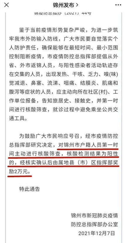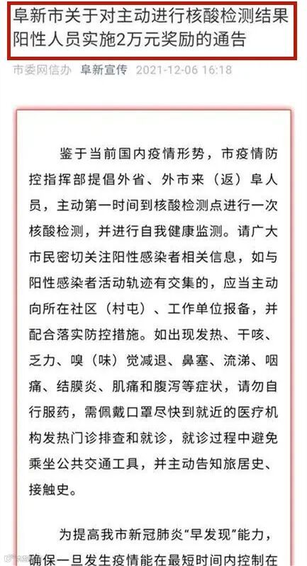 此前,辽宁省阜新市疫情防控总指挥部6日也发布了《关于对主动进行核酸检测结果阳性人员实施2万元奖励的通告》。