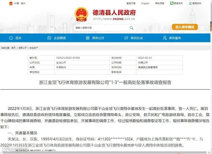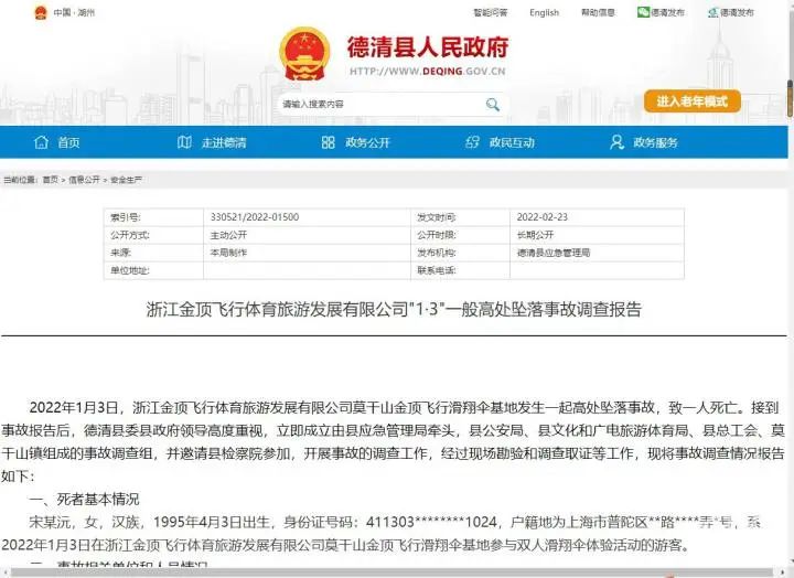 日前该起事故的调查报告对外发布,确定为一般生产安全责任事故,事故的主要原因是飞行员张某阳违反本单位制定的《双人滑翔伞飞行员守则》,在起飞前,未将游客宋某沅的护具腰带和腿带固定在座袋上,且未检查宋某沅的安全装备,导致其在滑翔途中坠落至地面。
