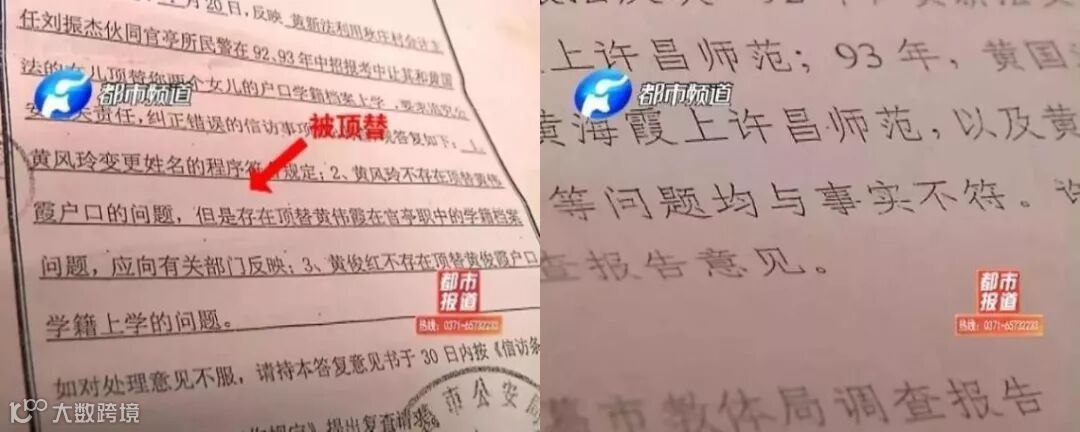 在目前公开的文件里,公安机关2010年答复黄风铃存在顶替黄海霞学籍档案的问题,而当地教体局却在2011年说,没有这回事。