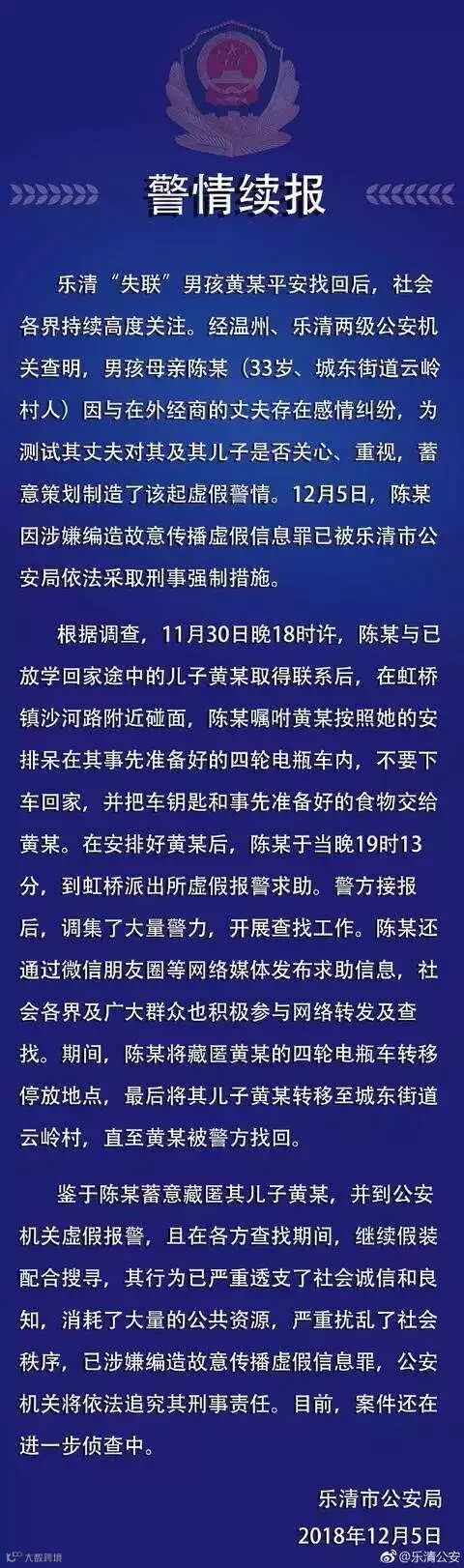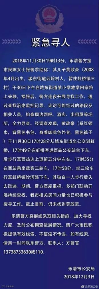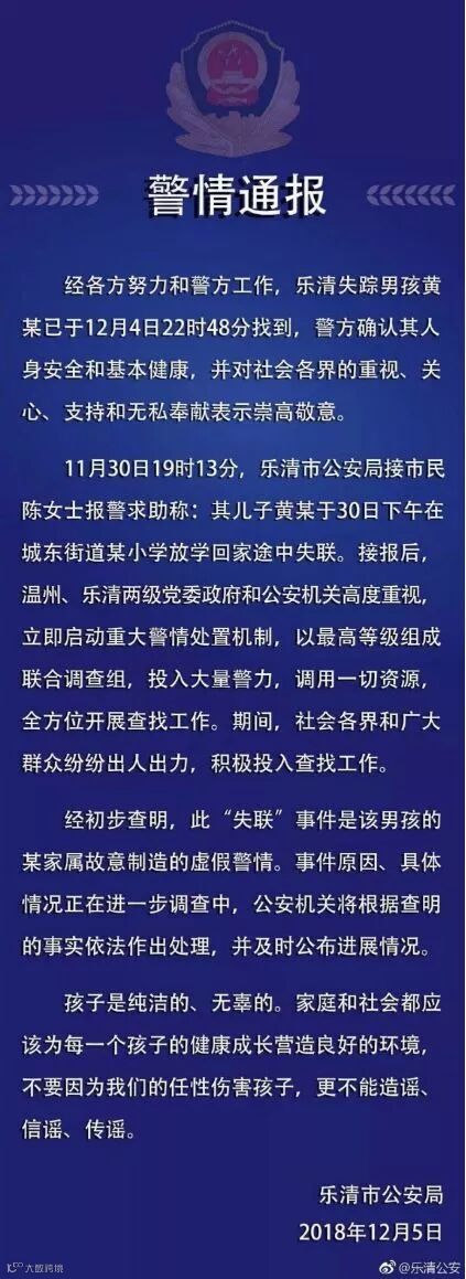 乐清失踪男孩黄某已于12月4日22时48分找到,警方确认其人身安全和基本健康。