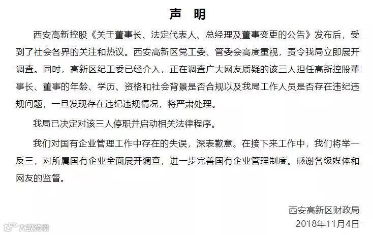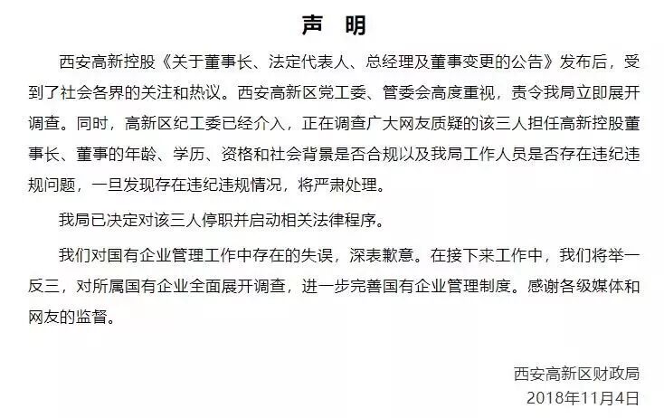 4日下午,西安高新区财政局发布声明称,高新区纪工委已经介入,已决定对该三人停职并启动相关法律程序。