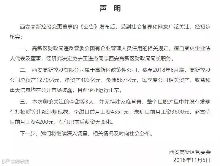 5日上午,西安高新区管委会发布声明称,高新区财政局擅自变更企业法人代表及董事,经研究决定免去王进杰同志西安高新区财政局局长职务。