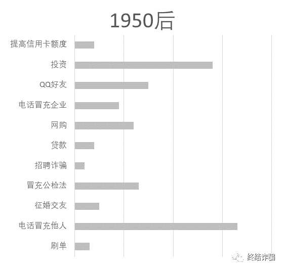 2.投资诈骗、冒充公检法:随着年龄的增长,占比越来越大,50后-30后(60-80岁)老人被骗比例最高,30后几乎只有可能被这两种手法诈骗。