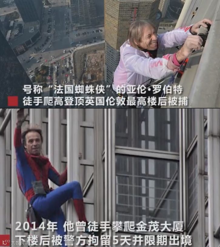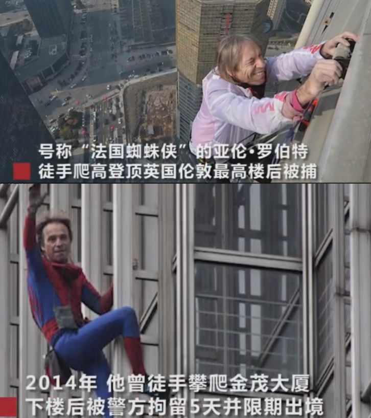 2、56岁“法国蜘蛛侠”徒手爬202米高楼 刚登顶就被警察带走 当地时间25日,亚伦·罗伯特在没有任何绳索和安全装置的情况下,徒手爬高登顶后,警员以“扰乱公共秩序罪”将他拘捕。据悉,罗伯特登顶过全球150多座摩天高楼,曾多次因爬楼被警察拘捕。(@新京报动新闻)