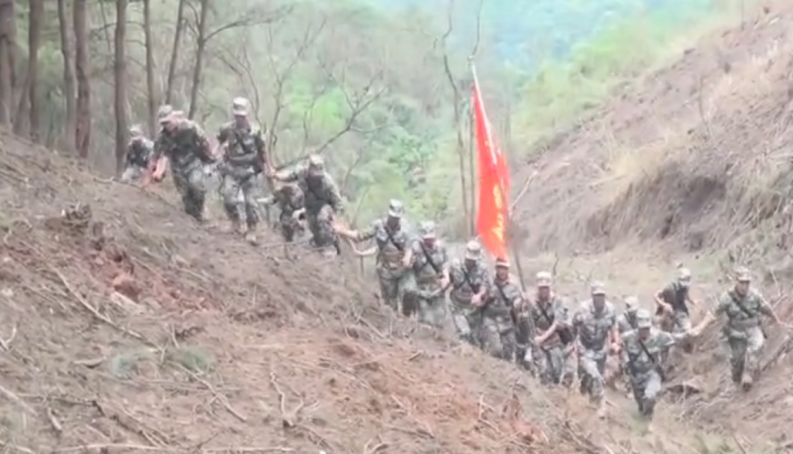 中国官兵手拉手“趟雷场”,中越边境广西段再无地雷隐患 25日,广西凭祥市法卡山地区的深排雷场上,中国40名扫雷官兵高唱《强军战歌》进行搜排。