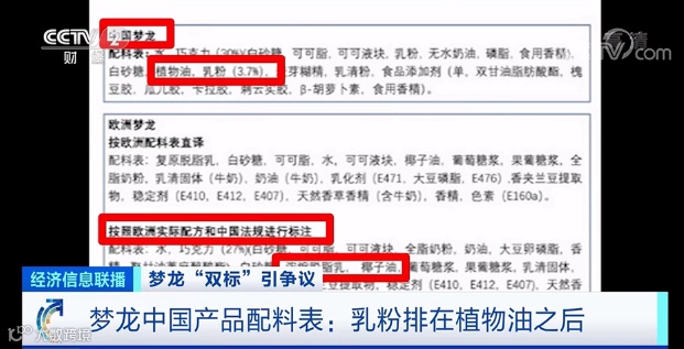 记者找到了一张联合利华此前向媒体公布的梦龙中国和欧洲产品的配料对比图,图表显示,排除掉不同地区标注成分的差异性,也就是梦龙欧洲产品如果按照中国的法规进行标注,含量从高到低排序,椰子油的排名在浓缩脱脂乳之后,而梦龙中国产品,奶粉则排在植物油,也就是椰子油之后。专家表示,植脂的价格相对乳脂更便宜些,包括椰子油等,大部分都没有乳脂贵。