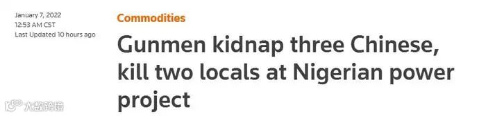 据外媒消息,当地警方6日表示,武装人员在尼日利亚中部尼日尔州绑架了在一个电力项目工作的3名中国公民,并杀害了两名当地工作人员。