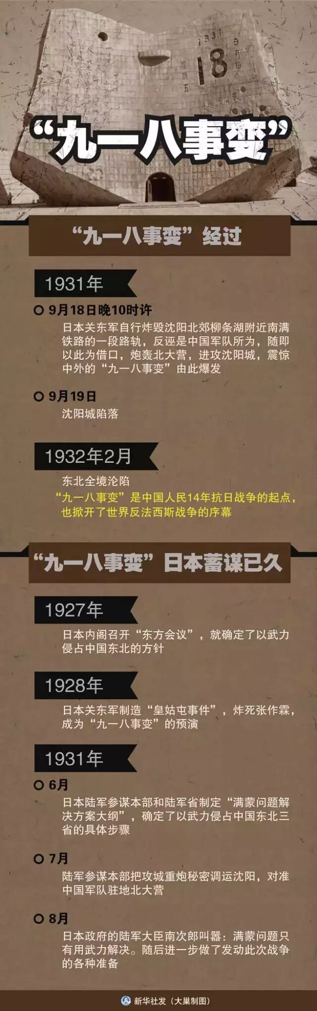 铺开历史的画卷:1931年9月18日,在日本关东军安排下,铁道“守备队”炸毁沈阳柳条湖附近的南满铁路路轨,并栽赃嫁祸于中国军队。日军以此为借口,炮轰沈阳北大营。中国人民从此开始了艰苦卓绝的抗日战争。