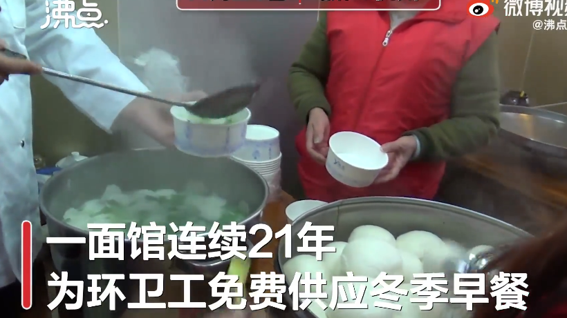 3、面馆老板冬季免费为环卫工供应早餐21年 浙江杭州一面馆从2000年起,每年冬季都会为环卫工人免费供应青菜年糕、稀饭、包子等早餐,如今已近21年。环卫工人们称,老板对大家很好,吃上热乎饭很暖和,为面馆老板点赞。(@沸点正能量)