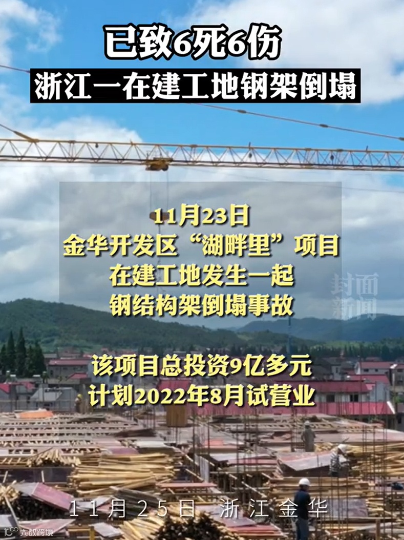 1、浙江金华突发事故,致6死6伤 23日,浙江金华一工地发生钢结构架倒塌事故,至25日8时共造成6人死亡、6人受伤。据悉,该项目位于金华婺城区经济开发区湖海塘区块,总投资9亿多元,计划2022年8月具备试营业条件。(浙江省应急管理厅网站)