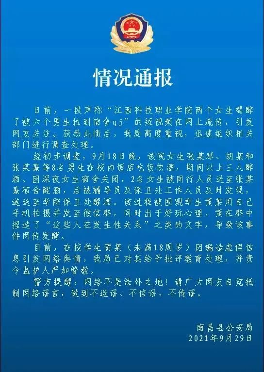 针对日前“江西科技职业学院两个女生喝醉了被六个男生拉到宿舍qj”的短视频在网上流传一事,江西南昌县公安局29日发布了情况通报,全文如下: