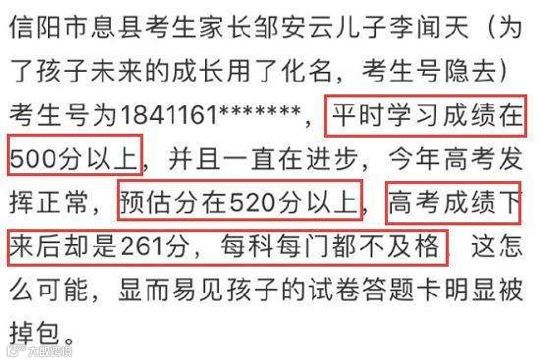 8月5日,一篇微信公众号的举报文章引爆舆论。文章称高考招生即将结束之际,4名河南高考考生家长向纪检监察部部门实名举报,称孩子高考答题卡被掉包,试卷被涂改,导致原本学习优秀的孩子在高考中得到惨不忍睹的分数。举报还直指该省招办负责人,称其“滥用职权、组织考试作弊、内外勾结掉包答题卡”。