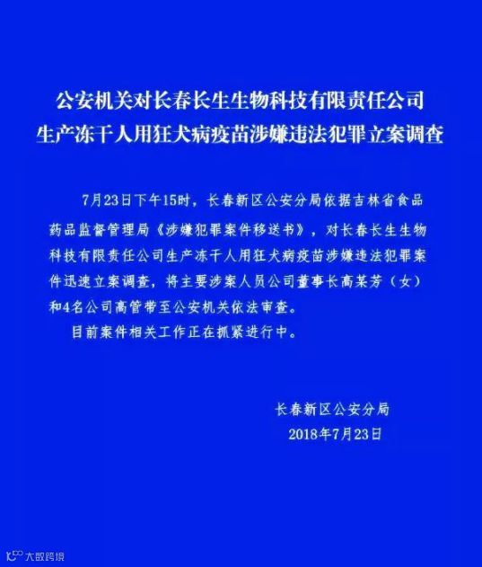 7月23日下午15时,长春新区公安分局依据吉林省食品药品监督管理局《涉嫌犯罪案件移送书》,对长春长生生物科技有限责任公司生产冻干人用狂犬病疫苗涉嫌违法犯罪案件迅速立案调查,将主要涉案人员公司董事长高某芳(女)和4名公司高管带至公安机关依法审查。