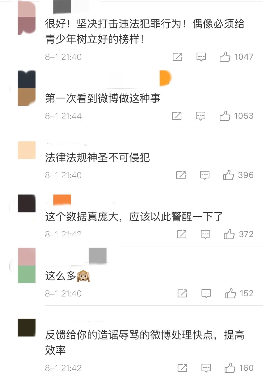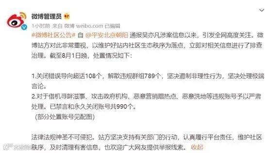 昨晚10时,@微博管理员 发布微博社区公告称,自 @平安北京朝阳 通报吴亦凡涉案信息以来,引发全网高度关注。微博站方对此非常重视,以维护好站内社区生态秩序为落点,立即对相关信息进行了排查治理。截至8月1日晚,处置情况如下: