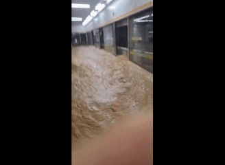 还有一名女子被积水冲进水坑,水流已没过她的头顶,