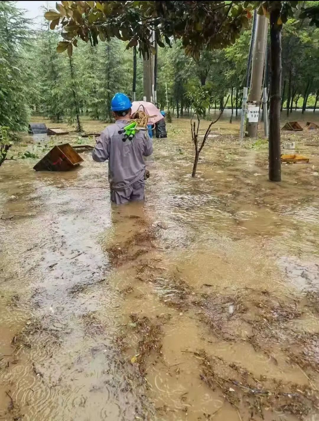 郑州供电公司员工趟着齐腰深的积水紧急抢修供电设施