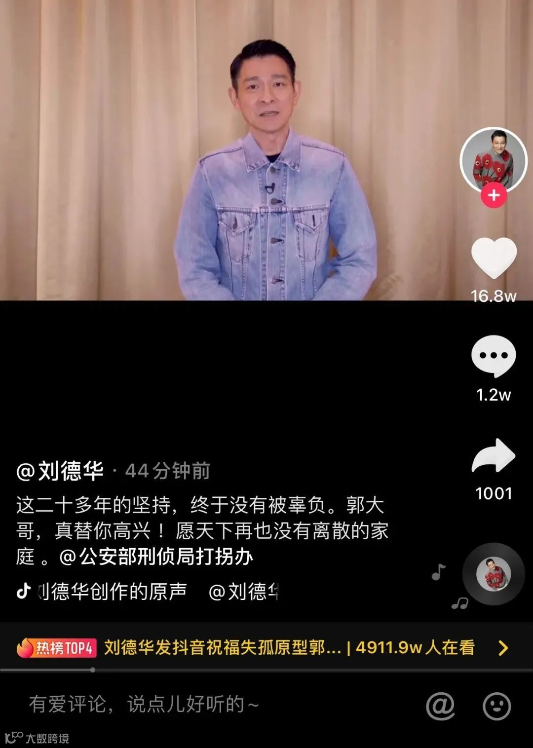 电影《失孤》中郭刚堂原型的扮演者刘德华,得知郭刚堂找到儿子的消息后,在社交平台发视频称,“郭大哥,真替你高兴!”并表示,这二十多年的坚持,终于没有被辜负,非常开心,而且非常振奋!