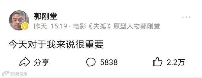 11日,也就是认亲当天,郭刚堂在社交平台上更新了一条动态:“今天对于我来说很重要。”