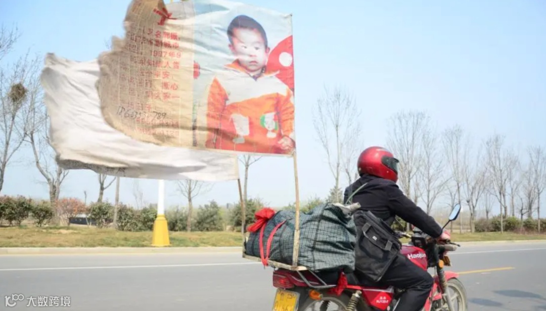 郭刚堂把儿子两岁的照片放大,印在油布上,制成旗子插在摩托车后座。旗帜上印有“儿子,你在哪里?爸爸找你回家!”的字样,郭刚堂随身背包里则装满了寻人启事。