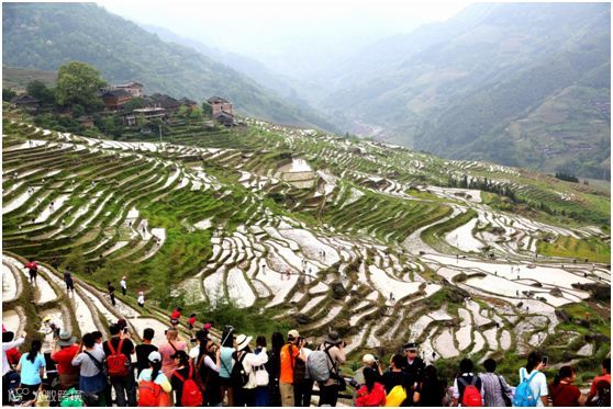 ▲ 2018年4月30日,游客在广西龙胜龙脊古壮寨观赏梯田美景。2018年“五一”假日,国内旅游收入871.6亿元,同比增长10.2%。新华社发(王滋创 摄)