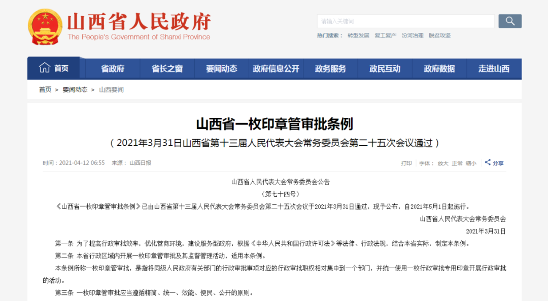 2021年3月31日,山西省十三届人大常委会第二十五次会议通过了一部地方性法规,法规名为《山西省一枚印章管审批条例》。《条例》已于5月1日起正式施行,这是我国第一部省级人大常委会涉及行政审批制度改革、推动政府职能转变的地方性法规。