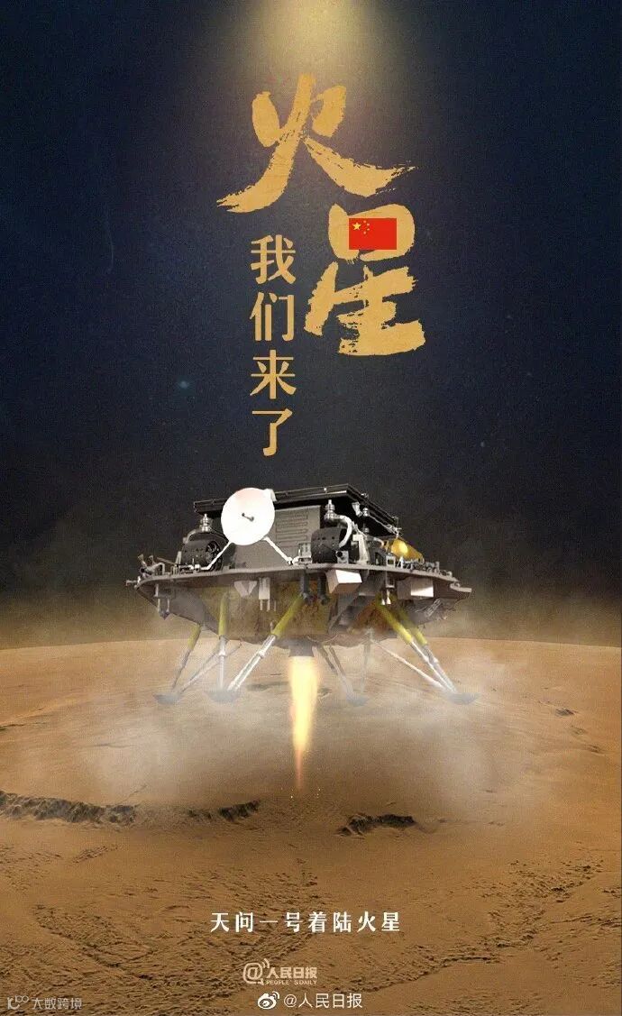 凌晨1时许,天问一号探测器在停泊轨道实施降轨,机动至火星进入轨道。4时许,着陆巡视器与环绕器分离,历经约3小时飞行后,进入火星大气,经过约9分钟的减速、悬停避障和缓冲,成功软着陆于预选着陆区。两器分离约30分钟后,环绕器进行升轨,返回停泊轨道,为着陆巡视器提供中继通信。后续,“祝融号”火星车将依次开展对着陆点全局成像、自检、驶离着陆平台并开展巡视探测。