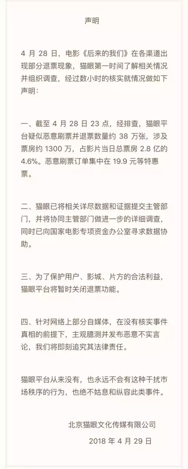 发行方猫眼电影的声明中表示,截至4月28日,猫眼平台疑似恶意刷票并退票数约38万张,涉及票房约1300万,占当日总票房2.8亿的4.6%。并指出恶意刷票订单集中在19.9元等特惠票。