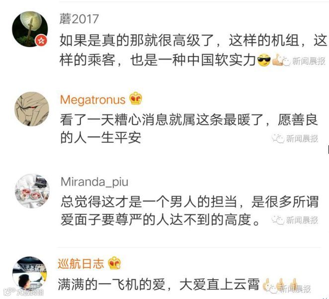 这则“暖闻”中,有很多绚烂的情感装扮:比如等待妻小的父亲的“下跪”;比如为了成全父亲,机组“大义凛然”地“一再拒绝关舱门”;再比如为了让孩子不留遗憾,机长发起的“进驾驶舱参观”的邀请;还比如在飞机这样一个密闭空间里随意发起的集体捐款……