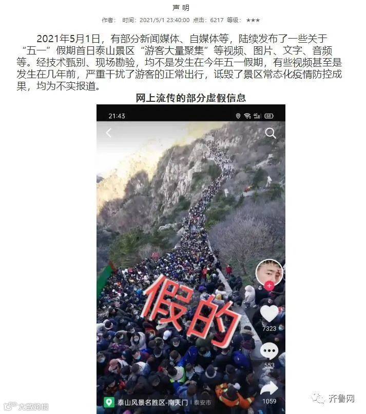 2021年5月1日,有部分新闻媒体、自媒体等,陆续发布了一些关于“五一”假期首日泰山景区“游客大量聚集”等视频、图片、文字、音频等。经技术甄别、现场勘验,均不是发生在今年五一假期,有些视频甚至是发生在几年前,严重干扰了游客的正常出行,诋毁了景区常态化疫情防控成果,均为不实报道。