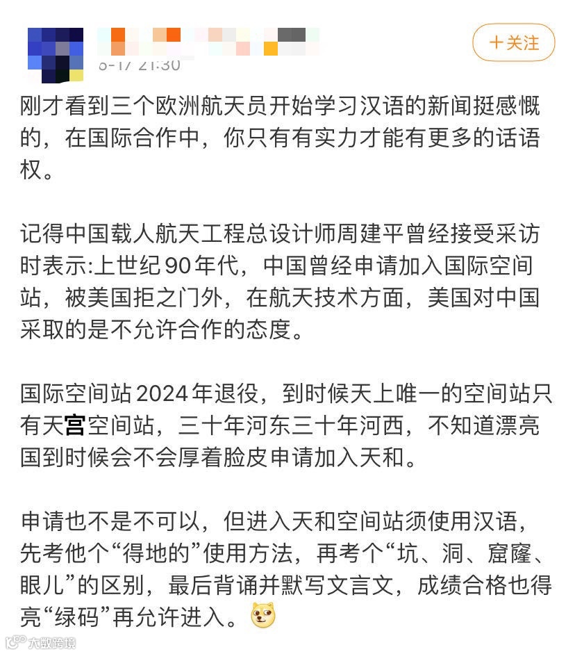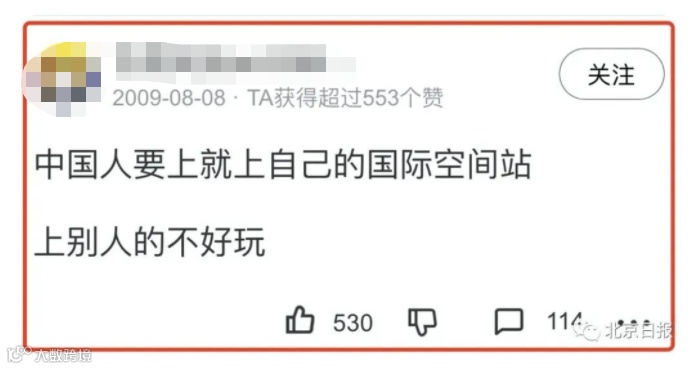 有名网友回答:“中国人要上就上自己的国际空间站,上别人的不好玩。”