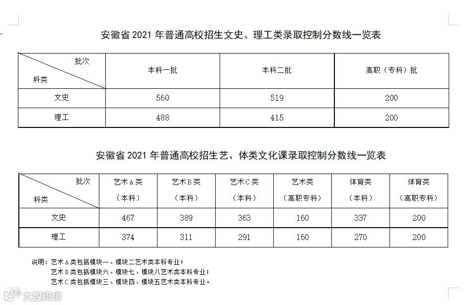 江西省2021年全国普通高校各类招生录取最低控制分数线:
