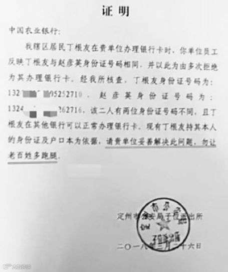 4、河北定州一派出所开“无奈证明”回复银行:勿让老百姓多跑腿 26日,定州市公安局子位镇派出所辖区居民丁根友身份证被某银行认为重号,不肯为其办理银行卡。本着不让群众跑冤枉路的精神,该所核实情况后向银行开具了这份证明。(燕赵晚报)