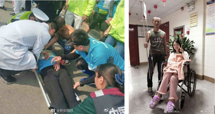 3、退伍军人弃赛救人:马拉松哪有救人要紧 马超是一名退伍军人,也是一名马拉松跑友,25日,在徐州半程马拉松赛中,马超发现一名女跑友已经没了意识,赶忙叫人打了120。虽然还有4公里就到达终点,但为救人他果断放弃完赛。(安徽网)