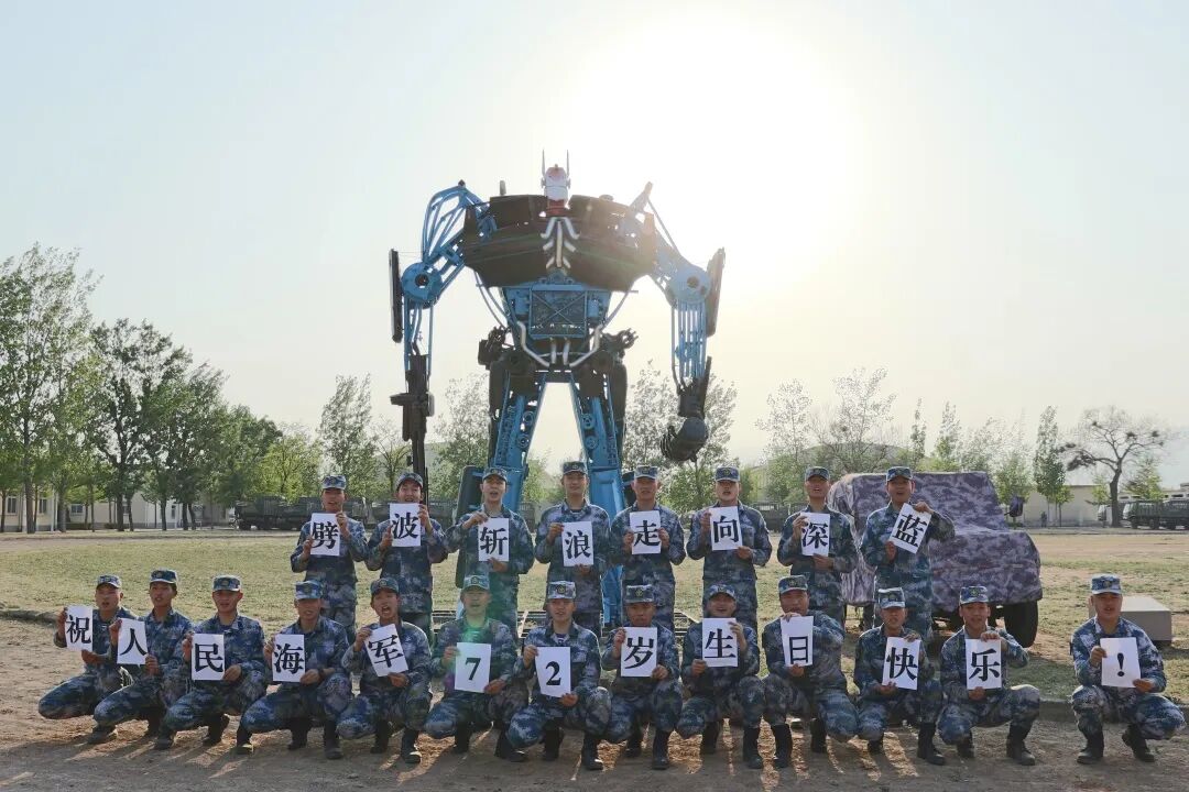 海军勤务学院某训练大队官兵在海军成立72周年之际,在自制“钢铁侠”模型前合影。