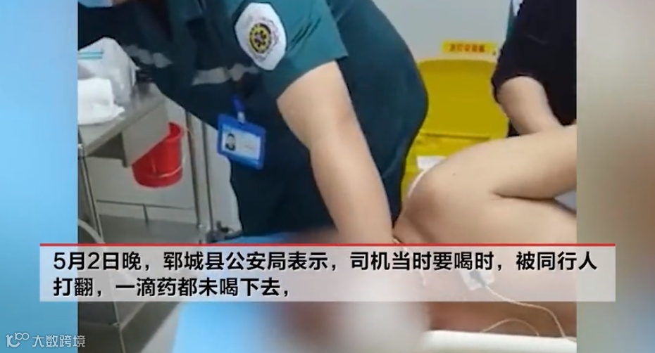2日晚,郓城县公安局表示,司机当时要喝农药时被同行人打翻,具体原因及情况警方还在调查中。
