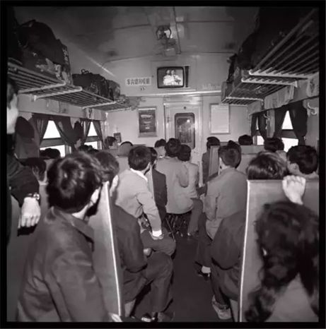 ▲1986年,从哈尔滨开往北京的18次特快列车上第一次出现电视机,全车厢的人都抬头聚精会神地看电视。王福春摄