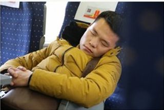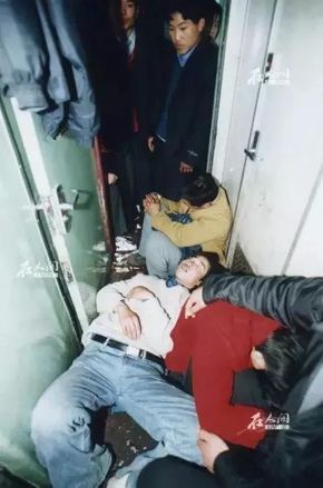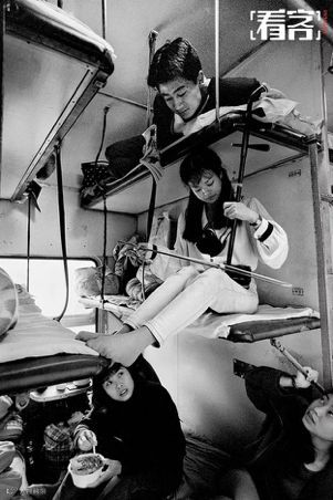 ▲1995年,在武汉到长沙的地段,车外高温38.9度,车里干脆就40几度的高温。一位民工没有座位,光着膀子躺在座席背上休息,为了不掉下来,他不得不抓住上面的行李架。王福春 摄