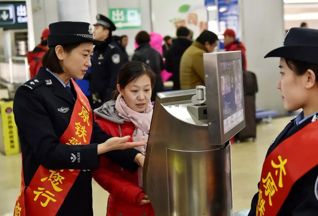 ▲2月1日,太原火车站派出所民警孟佳(前左)使用人脸识别系统对进站旅客进行“刷脸”识别。 新华社记者 曹阳 摄